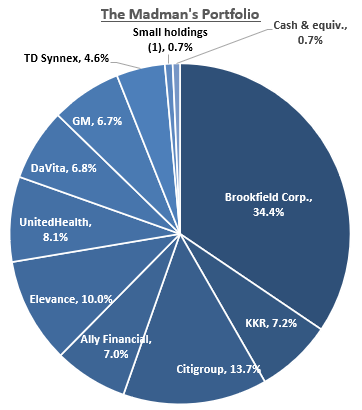 I sold down everything everything by 2%+ and nearly cut our Ally position in half. SNX and Brookfield were unchanged. So you can now think of us as having 42% of the portfolio in 2 alternative asset managers, Brookfield being the one I like more; 20% in 2 banks, where I now have more conviction in Citi, and 18% in two MCOs, both of which are well-positioned, well-run by good management teams, similarly cheap, have similar growth prospects, and earn attractive returns on capital.