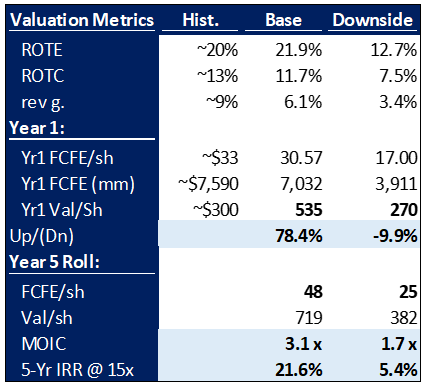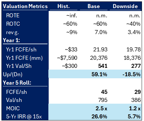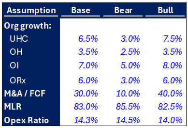 In UNH’s Optum, I assume Optum Health — the clinics — grows ~3.5% organically as clinics are generally already at capacity and mostly capture inflation. This says nothing about further value capture from the shift to risk-based contracting, where the clinics and doctors will receive more and more incentive payments for increasing patient health. Optum Insights, the software business, has pricing power as well as market penetration opportunities. For example, each time UNH buys a group of clinics and tucks them into Optum Health, it likely switches the analytics back-end to Optum Insights from existing solutions like Oracle Health. OptumRx, the pharmacy benefit manager, is likely to lose some market share to ELV’s CarelonRx, but capture some share from the remaining small PBMs in the industry, so I’ve assumed flattish market share, and that it captures long-term 1-2% drug volume growth, plus strong pricing power of ~4% on the administrative fees it charges drugmakers, pharmacies, and MCOs. In the downside case, I assume basically none of the good things happen, for example that the MLR stays elevated and margins stay really bad forever. And I assume Optum Health struggles to find acquisition targets.